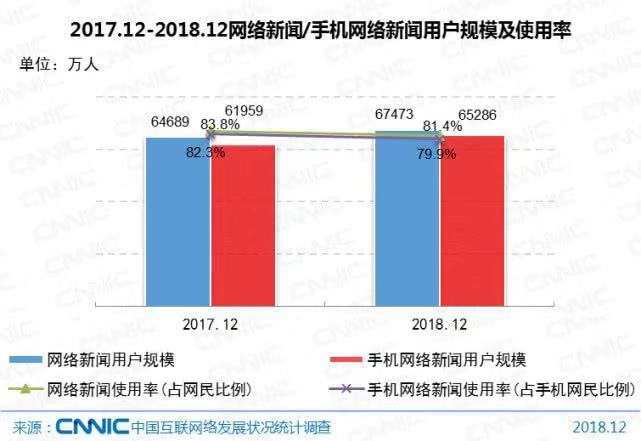 截至2018年12月,我国网络新闻用户规模达6.75亿,年增长率为4.3%,网民使用比例为81.4%。手机网络新闻用户规模达6.53亿,占手机网民的79.9%,年增长率为5.4%。