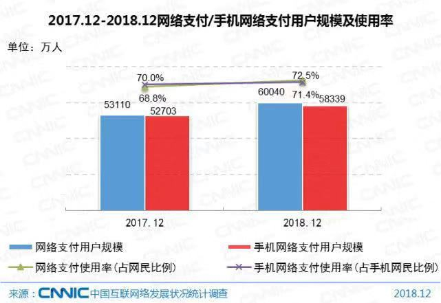 截至2018年12月,我国网络支付用户规模达6.00亿,较2017年底增加6930万,年增长率为13.0%,使用比例由68.8%提升至72.5%。手机网络支付用户规模达5.83亿,年增长率为10.7%,在手机网民中的使用比例由70.0%提升至71.4%。网民在线下消费时使用手机网络支付的比例由2017年底的65.5%提升至67.2%。