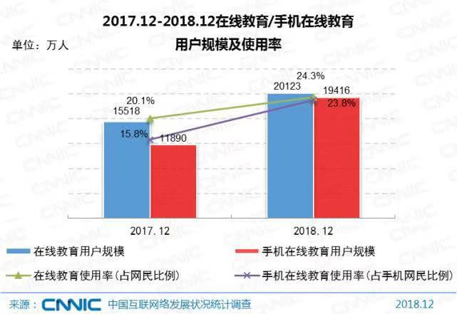 截至2018年12月,我国在线教育用户规模达2.01亿,较2017年底增加4605万,年增长率为29.7%;在线教育用户使用率为24.3%,较2017年底增加4.2个百分点。手机在线教育用户规模达1.94亿,较2017年底增长7526万,增长率为63.3%;手机在线教育用户使用率为23.8%,较2017年底增长8.0个百分点。