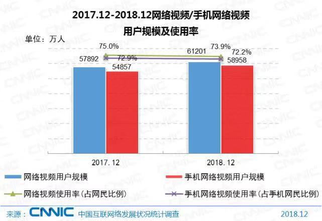 截至2018年12月,网络视频用户规模达6.12亿,较2017年底增加3309万,占网民整体的73.9%。手机网络视频用户规模达5.90亿,较2017年底增加4101万,占手机网民的72.2%。