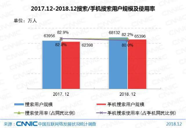 截至2018年12月,我国搜索引擎用户规模达6.81亿,使用率为82.2%,用户规模较2017年底增加4176万,增长率为6.5%。手机搜索用户规模达6.54亿,使用率为80.0%,用户规模较2017年底增加2998万,增长率为4.8%。