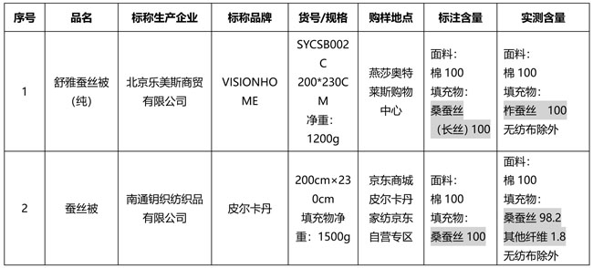 其中,标称商标为“VISIONHOME”和“皮尔卡丹”的2种样品纤维含量标注与实测值不符。