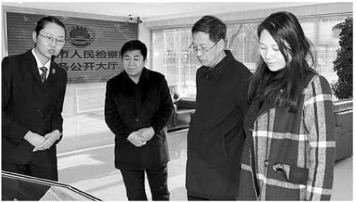全国人大代表、最高检特约监督员、赤峰星之路自闭症儿童康复中心校长王欣会(右一)到赤峰市检察院参观检务公开大厅,工作人员介绍检务查询系统。