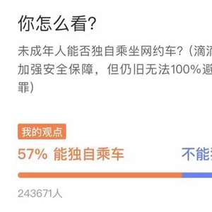 上述调查数据显示,截至3月3日12时,超过24万人投了赞成票,占总投票人数的57%。43%的网友,约18万人投了反对票,认为未成年人不宜单独乘坐网约车。