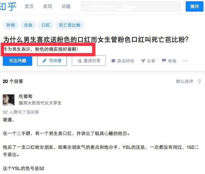 在知乎上输入“死亡芭比粉”,把各种问题和回答归纳总结起来,基本可以得出四个字——男女有别。大部分男性用户认为,粉色很好看,不明白为什么会与“死亡芭比”划等号。“收到‘死亡芭比粉’,翻不翻脸?”类似这样的提问也很多。