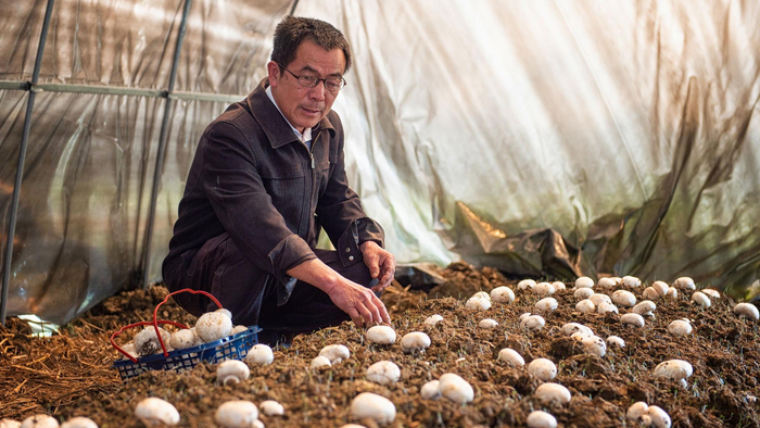 孔蒲中轻轻拨开表层的泥土,露出一片密集的“小白点”,他笑着说:“一个礼拜内这些‘小白点’就能长成大蘑菇。”在2019年开春之际,他希望自己在接下来的一年能把蘑菇种好,“我还准备利用大棚下面的空间再做点事情,养点蚯蚓之类的”,孔蒲中开心地说,“这叫什么来着?循环农业!”老孔还真是个能琢磨的新型农民。