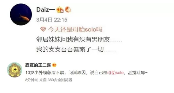 solo,源于意大利语,指乐器独奏、独唱、单人表演。母胎solo,是说自出生以来,一直都是自己一个人。直白点,就是从来没有谈过恋爱,一直是单身。