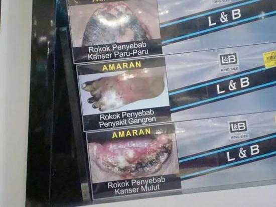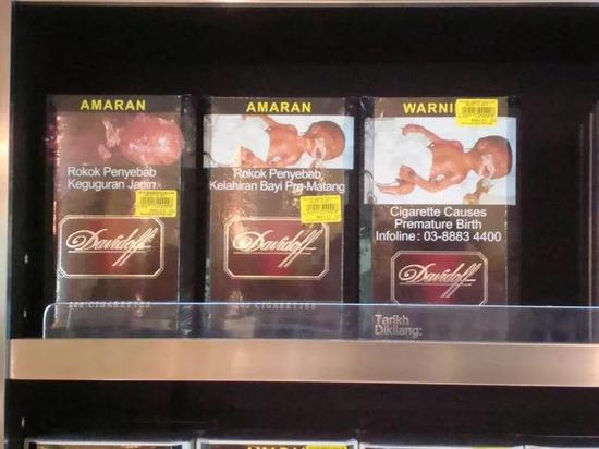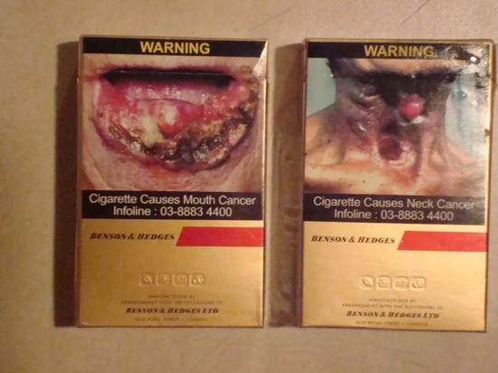 可以看到,马来西亚、德国、泰国等地的香烟烟盒上印着肺癌、口腔癌、死婴等照片,触目惊心。
