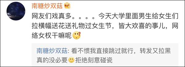 而在另外一部分人眼里,“女生节”只是个民间兴起又被商家作为营销手段在年轻人中流行起来的节日,本身属性更偏向娱乐,认为那些发飙的网友是上纲上线。