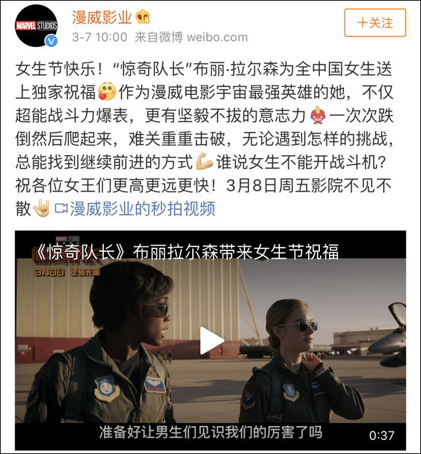 然而今天(7日),@漫威影业 发布了一个视频,扮演“惊奇队长”的布丽·拉尔森向广大中国粉丝送来了“女生节”的祝福语,因为“女生节”被部分网友认为是“侮辱女性”而产生的节日,导致其被指与影片蕴含的“女权内涵”相背,宣发翻车。