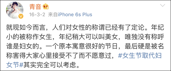 就连不少公众人物也表达了支持态度,资深情感节目主持人、CCTV特约心理专家青音便认为从节日名字考量的话,“女生节”更容易为人们所接受。