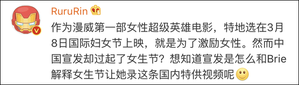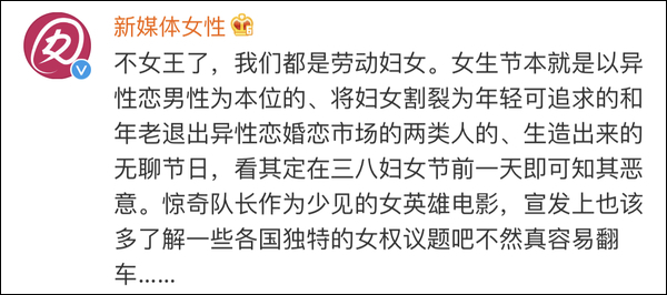 尤其在《惊奇队长》被认作是一部激励女性崛起的女权主义电影的情况下,这个祝福让不少网友觉得别有用心。