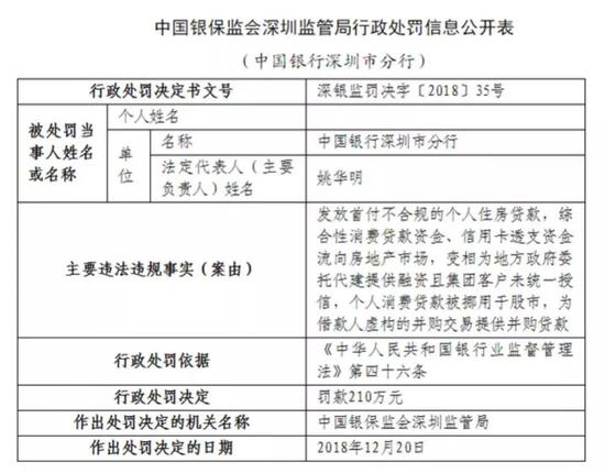 今年1月18日,中国银行深圳市分行因个人消费贷款被挪用于股市,受到中国银保监会深圳监管局的处罚。罚单显示,该行因发放首付不合规的个人住房贷款,综合性消费贷款资金、信用卡透支资金流向房地产市场,变相为地方政府委托代建提供融资且集团客户未统一授信,个人消费贷款被挪用于股市,为借款人虚构的并购交易提供并购贷款的违法违规事实,被监管部门罚款人民币210万元。