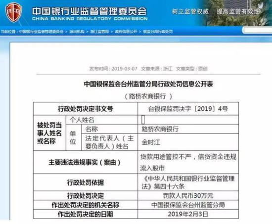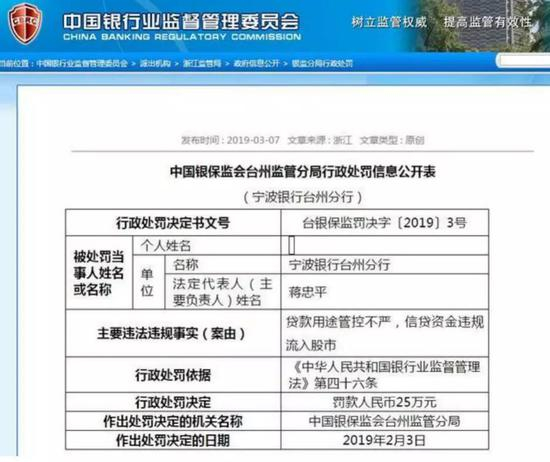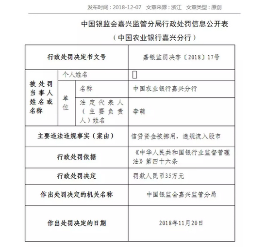 稍早一些,中国农业银行嘉兴分行也因“信贷资金被挪用,违规流入股市”,被监管部门罚款35万元。