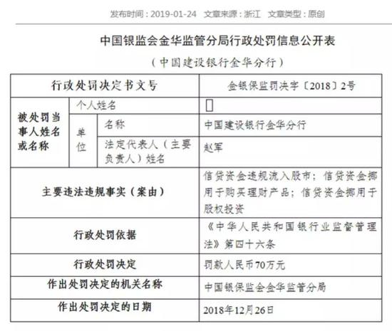 根据监管今年1月24日公布的处罚信息显示,中国建设银行金华分行因信贷资金违规流入股市;信贷资金挪用于购买理财产品;信贷资金挪用于股权投资的违法违规事实,受到监管部门罚款70万元的处罚。