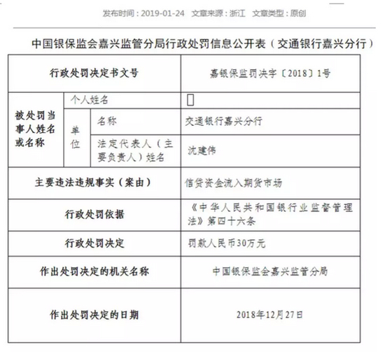 此外,还有信贷资金违规流入期货市场的。银保监会官网1月24日披露,交通银行嘉兴分行因信贷资金流入期货市场,被处罚30万元。