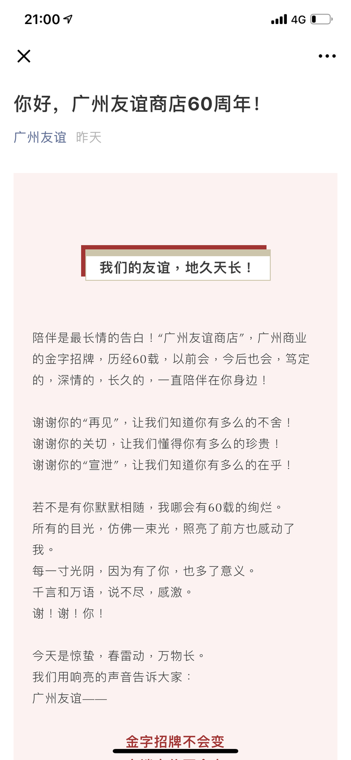 “陪伴是最长情的告白!”6日晚,广州友谊商店一则“官宣”,短时间内在网络上传播开来。这则以“我们的友谊,地久天长!”为题的“官宣”,语言直接简明,而且相当煽情,其中直接表明:“广州友谊商店”这个广州商业的金字招牌不会改变。