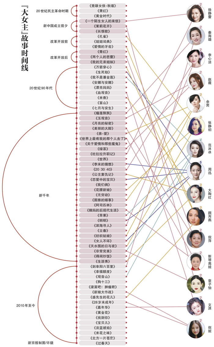 紧随周迅之后,范冰冰共拍摄电影4部;大陶红、张静初、颜丙燕、余男各有3部;倪萍、赵薇、斯琴高娃、李心洁、徐静蕾、章子怡、秦海璐、文淇、倪妮各有电影2部。女性题材电影在2000年至2010年间数量最多,共30部。虽然新千年周迅拍片数量最多,但是5部片子总票房才5100万。