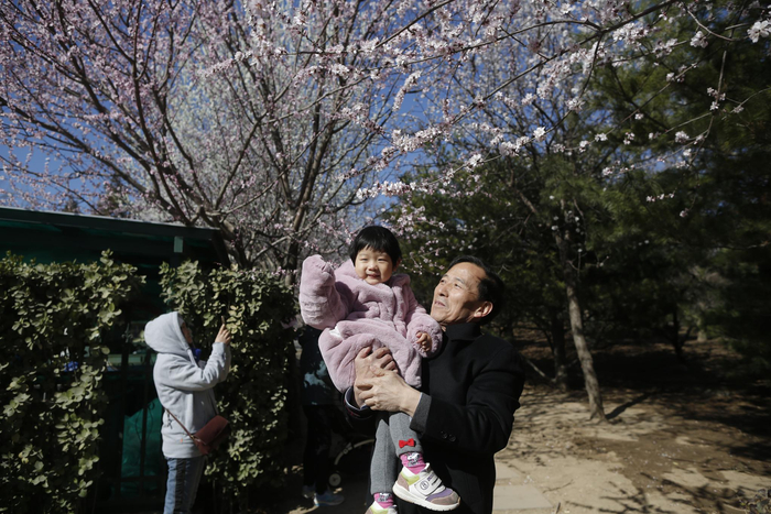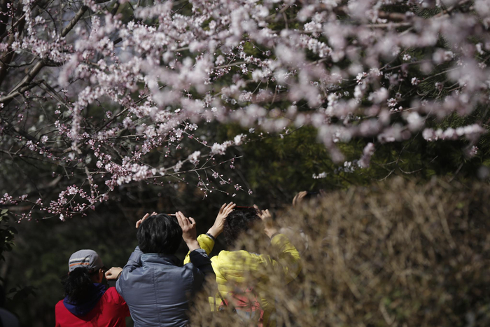市民欣赏盛开的山桃花。摄影/新京报记者 侯少卿