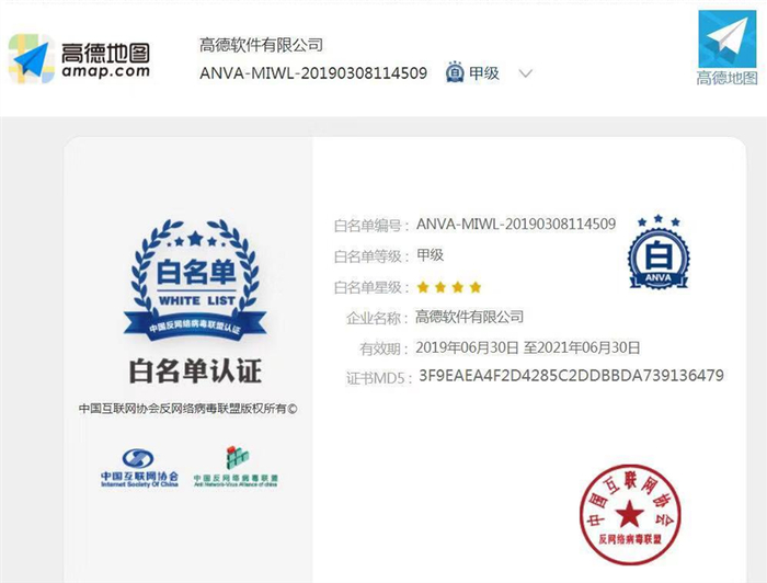 近日,中国反网络病毒联盟(ANVA)公布了2019年“移动互联网自律白名单”,高德地图连续第三年入选,并成为获得甲级“移动互联网自律白名单”认证的电子地图App。