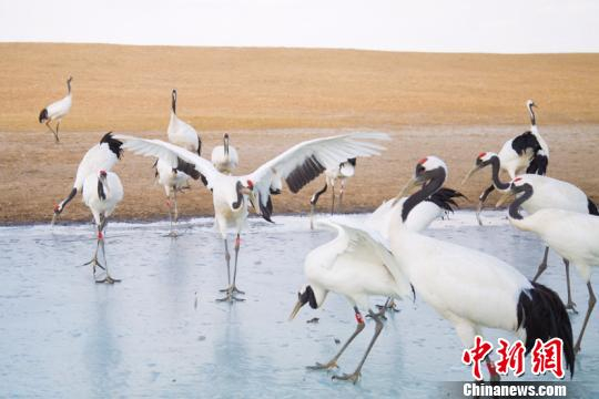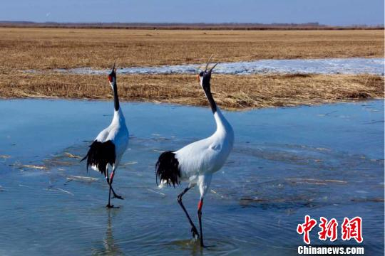 中新网齐齐哈尔3月14日电(记者 王琳)黑龙江扎龙国家级自然保护区于14日发布消息,此时冬去春来、候鸟北归,该保护区内丹顶鹤野化放飞训练壮观唯美,吸引大批摄影师前来抢拍“仙鹤衔春”美景。