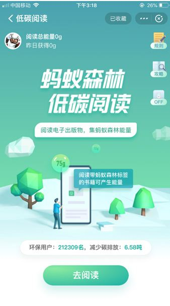 用户可以在支付宝首页搜索【春天在哪里】或【书旗小说】进入到活动页面,《流浪地球》《大江大河》《我们仨》《东宫》《小王子》等数万本出版书的电子版等你来读。规则显示,阅读带有蚂蚁森林绿色能量标识的电子书即可获得绿色能量,当日获得能量上限为75G。