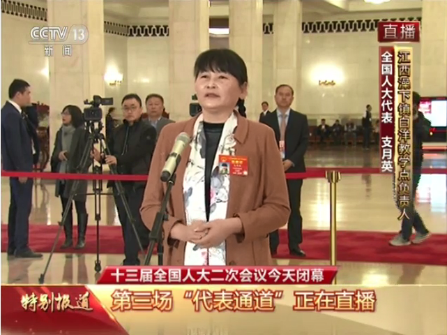 3月15日上午,江西澡下镇白洋教学点负责人、全国人大代表支月英在十三届全国人大二次会议第三场“代表通道”集中采访活动中,回复记者关于“乡村教育”的提问。