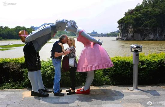 在桂林市象鼻山公园内,一对外国游客在公园内即兴模仿雕塑的情景,相拥而吻。