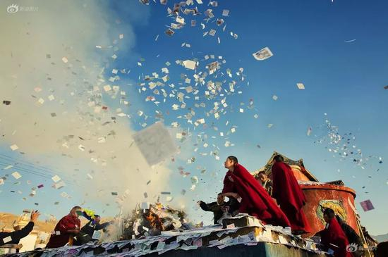 藏历新年期间,阿坝县各大藏传佛教、本波教寺庙举行大型诵经祈祷活动,数万信众前往朝拜听经,场面隆重。照片中的藏族同胞们在寺庙外扬撒龙达,为新年祈福。