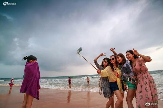 斯里兰卡的阿洪加拉海滩上,几名中国女孩正在开心的自拍。2019年春节长假期间,不少国人选择出国旅行,气候宜人、海景美丽、消费经济的邻近国家成为了很多中国游客的选择。
