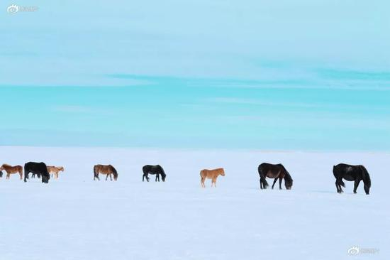 狂风大雪中,几匹蒙古马一字排开,点缀着白雪世界。