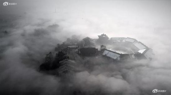 由于冬季河水与空气的温差,台儿庄古城出现晨雾缭绕、白雾穿城的美景,城中建筑和树木若隐若现,恍若天宫浮云、海市蜃楼。