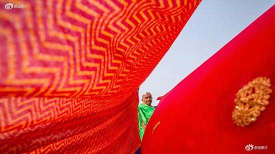 2019年2月的印度恒河大壶节上,一位印度妇女着衣在恒河里洗浴,起岸后清洗莎丽并手持晾晒,色彩十分艳丽。 大壶节是印度教参与人数最多的集会。阿拉哈巴德、哈里瓦、乌疆和纳锡这4座城市分别每3年庆祝一次大壶节,也就是每个地方相隔12年举行一次。从1月9日开始,为期42天。