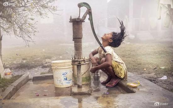 清晨,一位小女孩在水井前梳洗着长发。
