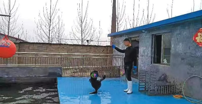 ▲3月2日,山东省嘉祥县梁宝寺镇,一名驯养员正训练海狮表演顶球。一旁的彩钢板房即为海狮生活区,每只海狮的活动空间仅3平米左右。 图片来源:新京报