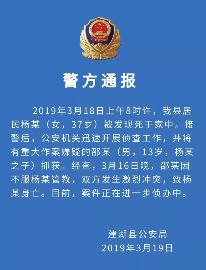 2019年3月18日上午8时许,我县居民杨某(女,37岁)被发现死于家中。接警后,公安机关迅速开展侦查工作,并将有重大作案嫌疑的邵某(男,13岁,杨某之子)抓获。