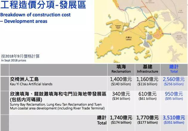 欣澳填海、龙鼓滩填海、屯门沿海开发区,填海所需费用是340亿港元;基建費用约610亿港元。
