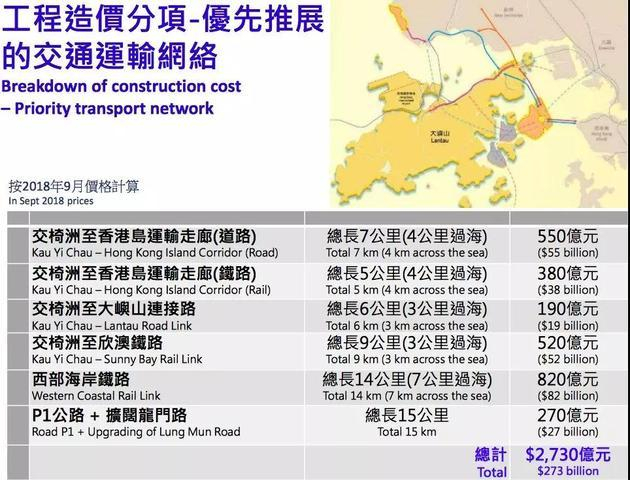 优先推展的交通运输网络共6个项目,总造价2730亿港元。