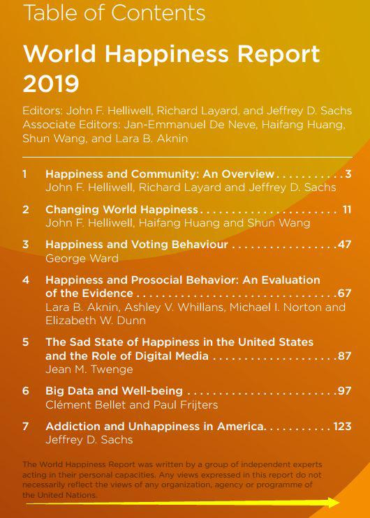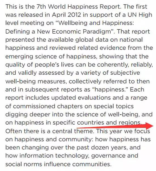 “这是第七届全球幸福报告。该报告于2012年首次发布,内容包括对福祉的研究,以及特定国家及地区的幸福指数等评估。”