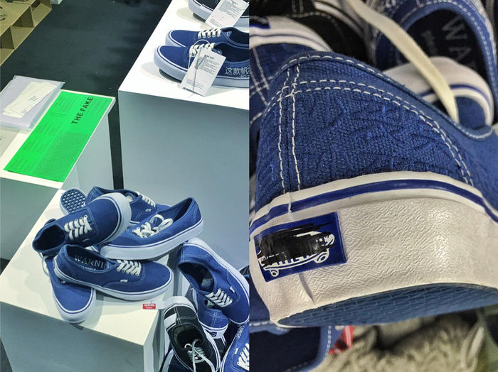 这个“The Fake”抄袭系列以一种非常“明目张胆”的态度,用刺绣技艺在鞋帮上写明“这款帆布鞋是抄袭某滑板品牌”。