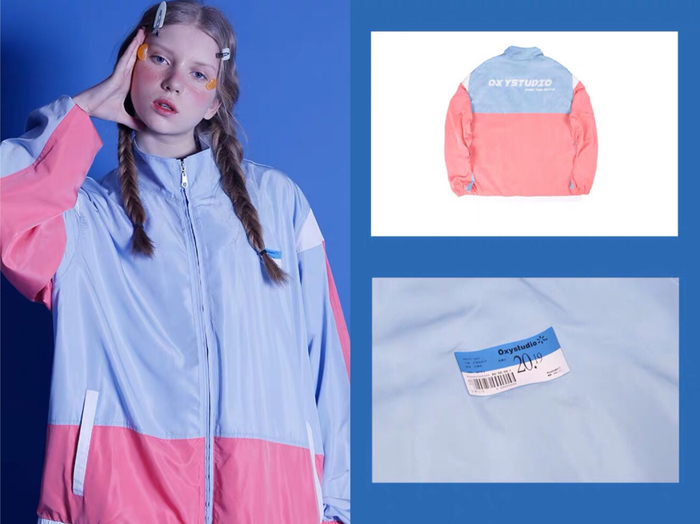 拼色的防晒服格外好看,虽然没有任何Logo,但是粉蓝与粉色的拼接让人一看就想起了纯净、无污染、天然等一切与水相关的美好事物。细节处理也十分到位,胸前的标志做成了超市商品标签,“2019”、“OXY studio”等元素都融入其中。