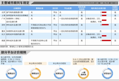 21世纪经济研究院分析师统计发现,目前国内30多个城市出台了顺风车管理办法,梳理北京、上海、广州、深圳、重庆、长沙、南昌等代表性城市政策发现,对于顺风车运行标准的规定不一,比如最高限价、每天合乘次数、平台收费标准、是否要求本地车牌等。