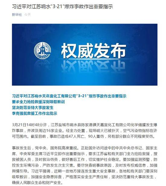 事故发生后,党中央、国务院高度重视。正赴国外访问途中的中共中央总书记、国家主席、中央军委主席习近平立即作出重要指示,要求江苏省和有关部门全力抢险救援,搜救被困人员,及时救治伤员,做好善后工作,切实维护社会稳定。要加强监测预警,防控发生环境污染,严防发生次生灾害。要尽快查明事故原因,及时发布权威信息,加强舆情引导。习近平强调,近期一些地方接连发生重大安全事故,各地和有关部门要深刻吸取教训,加强安全隐患排查,严格落实安全生产责任制,坚决防范重特大事故发生,确保人民群众生命和财产安全。