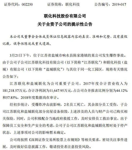 经初步统计,受爆炸冲击波影响,2名员工死亡,其余部分员工受伤,子公司江苏联化和盐城联化部分房屋设备损毁,上述涉及的人员与财产公司已购买相关保险,同时,公司积极配合当地政府救援工作,及时安排员工救治事宜,出于保障员工安全和生产安全的考虑,公司子公司江苏联化和盐城联化暂时处于停产状态,上述事项对公司的影响暂未确定。