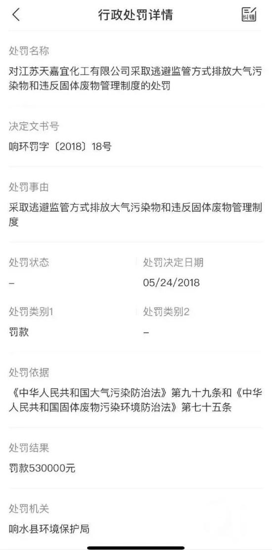 公开资料显示,天嘉宜化工厂在过去三年共有6条行政处罚信息,处罚原因包括违反固体废物管理制度、违反环境影响评价制度、违反大气污染防治管理制度等。