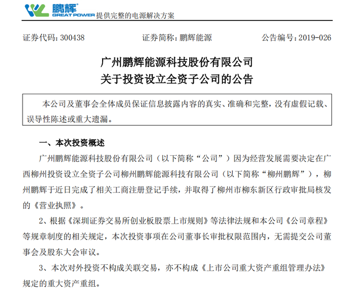新京报快讯(记者 孙晓萌)3月25日,广州鹏辉能源科技股份有限公司(简称“鹏辉能源”)发布公告表示,因经营发展需要决定在广西柳州投资设立全资子公司柳州鹏辉能源科技有限公司,已于日前完成了相关工商注册登记手续。