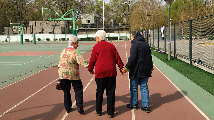 三位老人(左起:李凤莲、梅宜静、董存梅)重回校园,在操场上手牵手参观。新京报记者 马瑾倩 摄