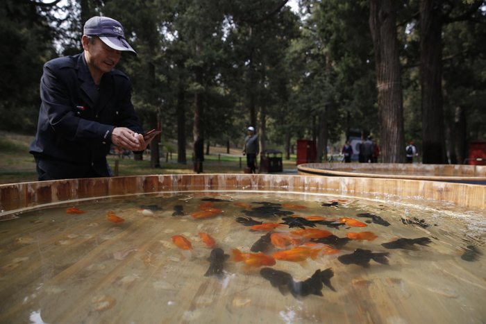 同时,为使游客感受到老北京“木海观鱼”的实景体验,观赏台背景分别以御园园林、宫廷建筑、四合院等老北京元素为主题进行布景装饰。记者了解到,今年活动期间游客仍可夜赏金鱼,公园进一步优化“木海”照明设备,增加了LED环形防水灯带,使照明效果更加柔和、立体,方便游客拍照。