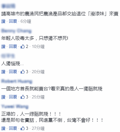 而韩国瑜返回高雄市发生“泼漆妹”推打市民一事后,也有岛内网友批评称,“人独脑残”。还有人说:民进党不倒,台湾不会好。更有人讽刺:请高雄市的农渔民把农渔产品都交给这位“泼漆妹”来卖。