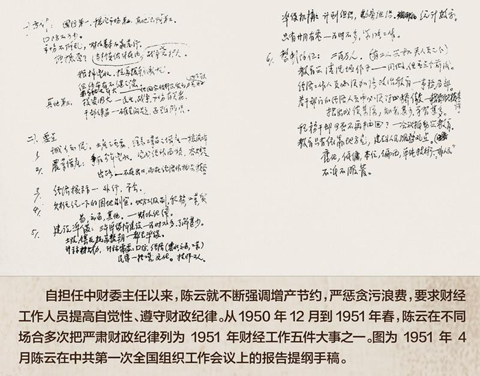 新中国成立初始,陈云任中央人民政府委员、政务院副总理兼财政经济委员会主任,主持全国的财政经济工作。作为国家最主要的理财人,经手钱财以亿万计,生活却十分简朴自律。那时,他办公处所的暖气烧得不好,冬天办公室里很冷,行政部门看到陈云经常感冒,便给他的办公室里配了电炉子,但他为了节约用电,很少用。他只开过几次电炉子,那都是在苏联顾问到他办公室谈话之前为他们准备的。正是由于陈云的以身作则,中央财政经济委员会上下形成一种勤俭节约的风气。